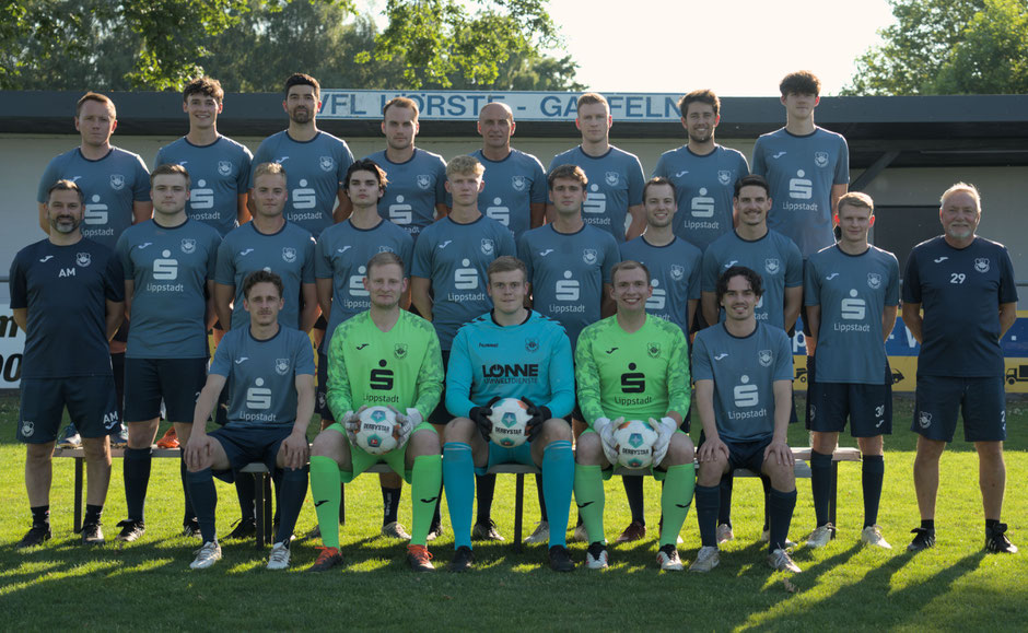 Die Mannschaftsfotos zeigen den Spielerkader und Trainer der 1. Fußballmannschaft des VfL Hörste-Garfeln in der Saison 25/26: